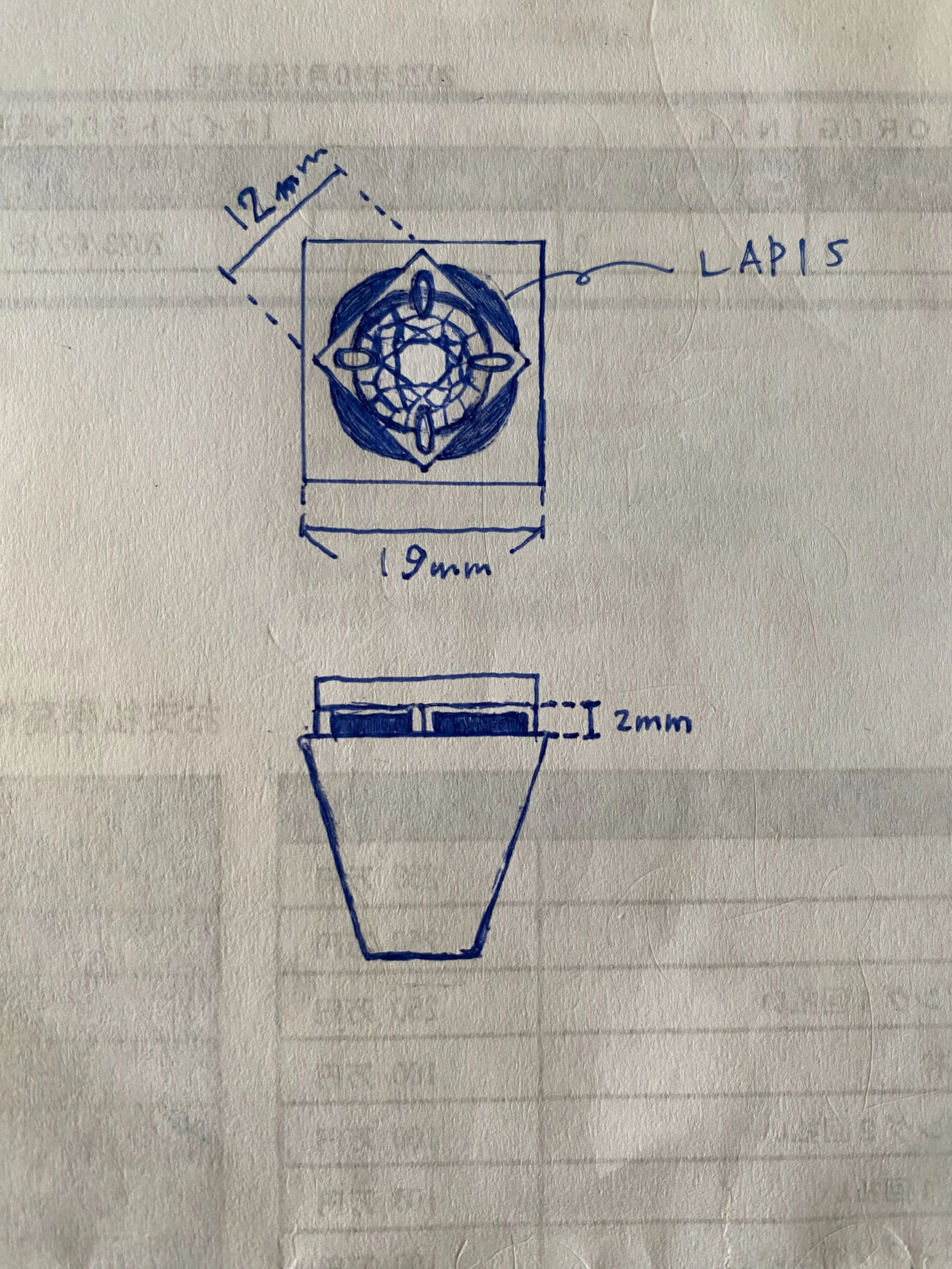 石:ダイヤモンド(当初はパライバトルマリンだったが、ダイヤに変更)囲みはラピスのリカット。
